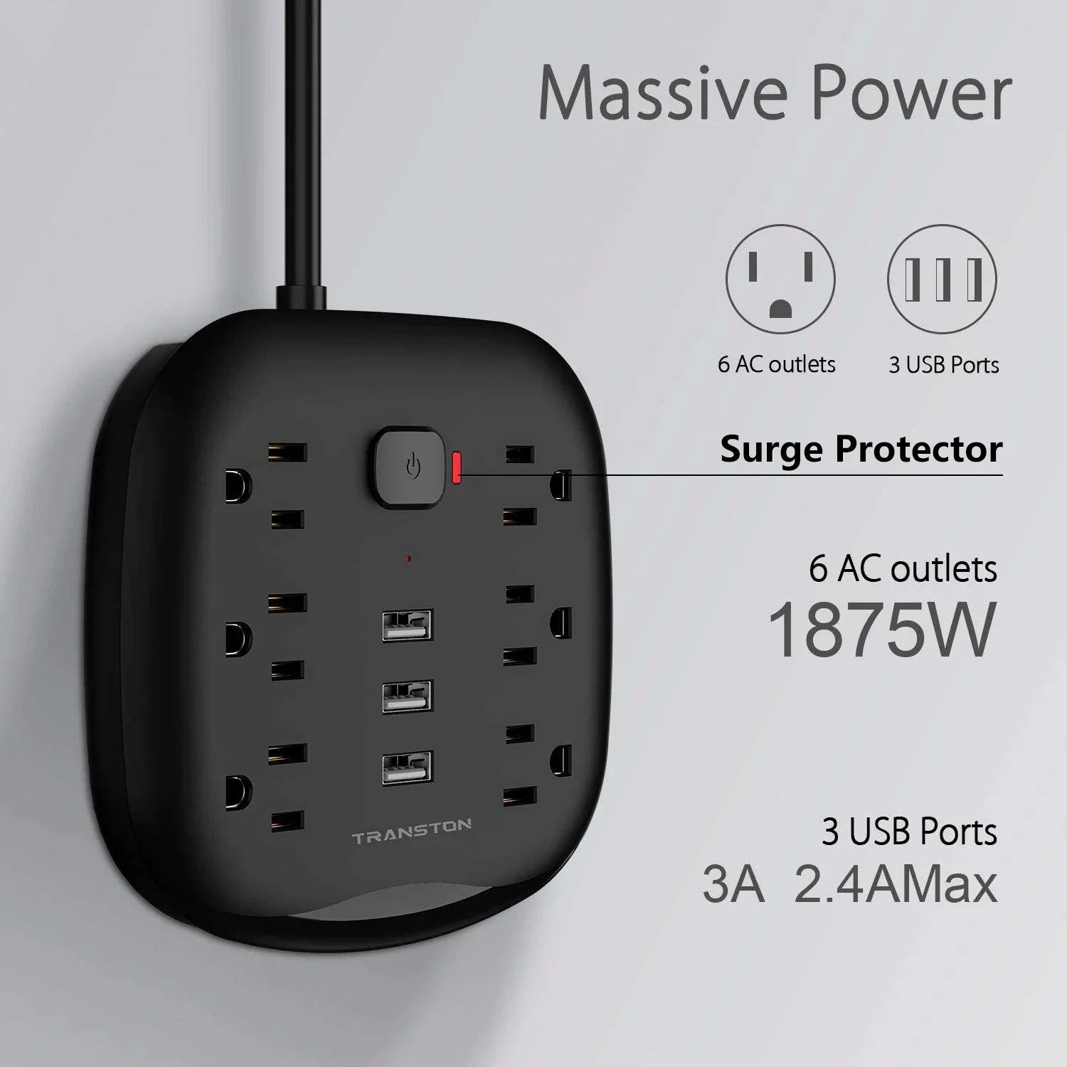 β‘ 6 Outlets + 3 USB Ports β Connect multiple devices simultaneously